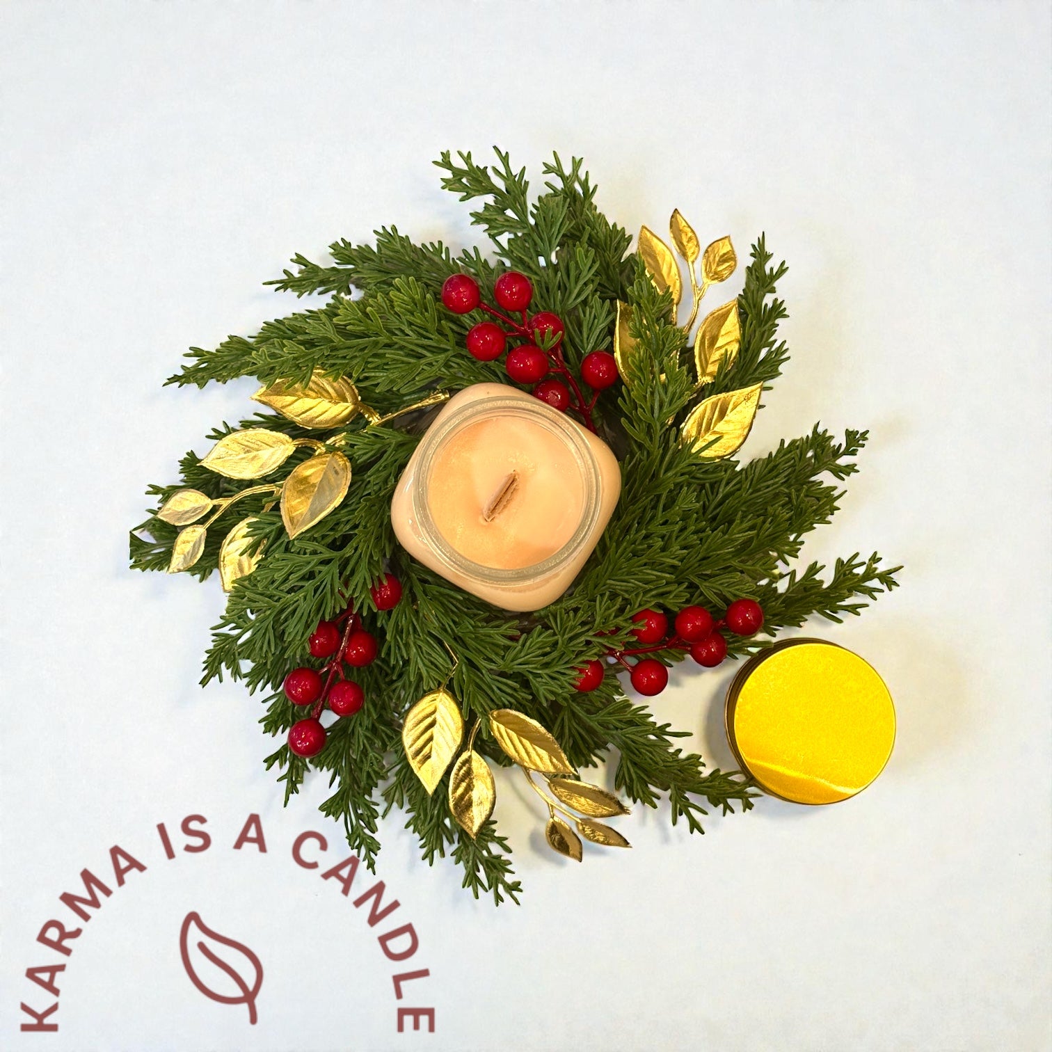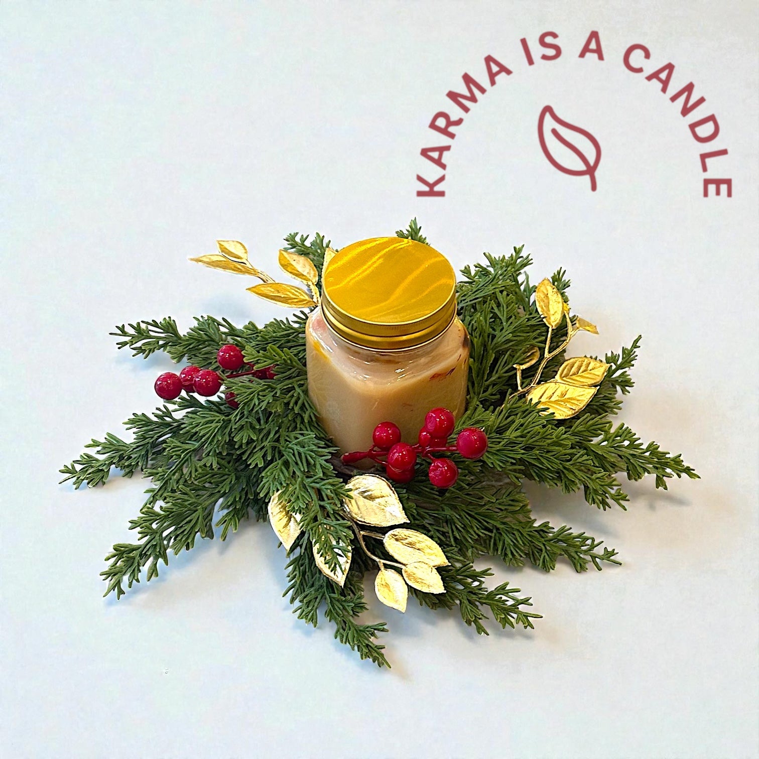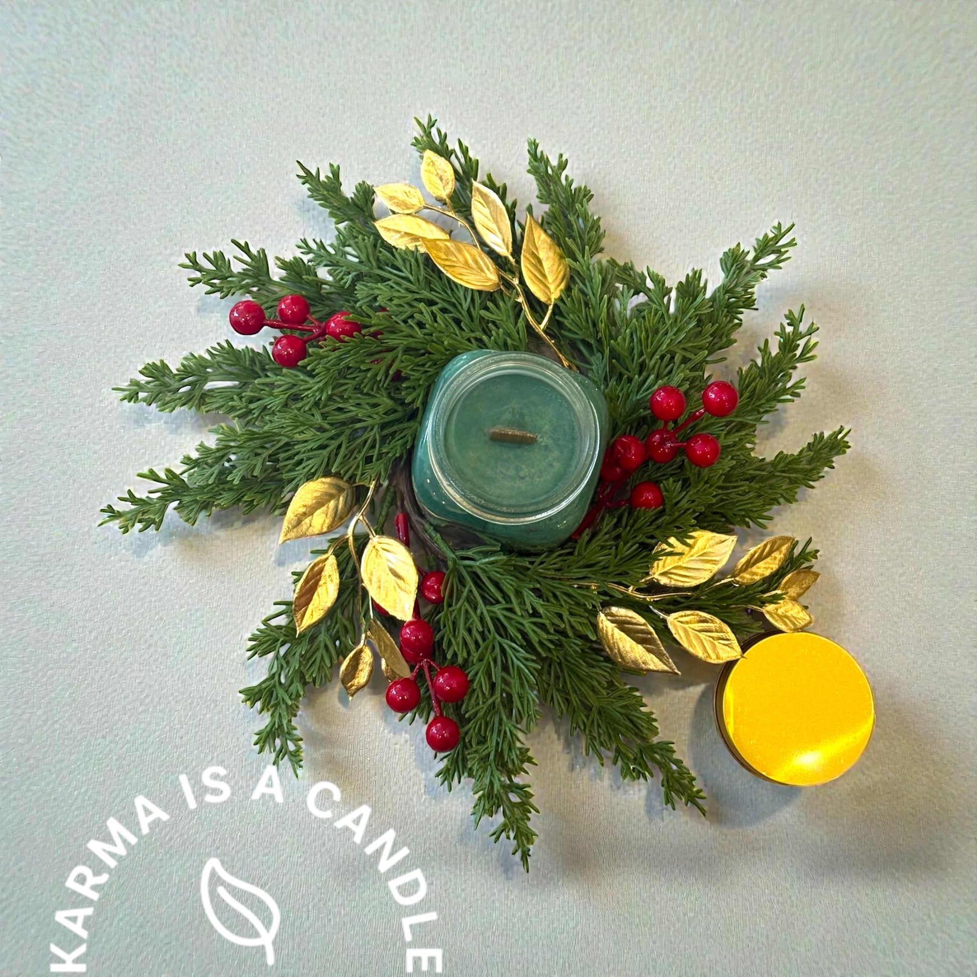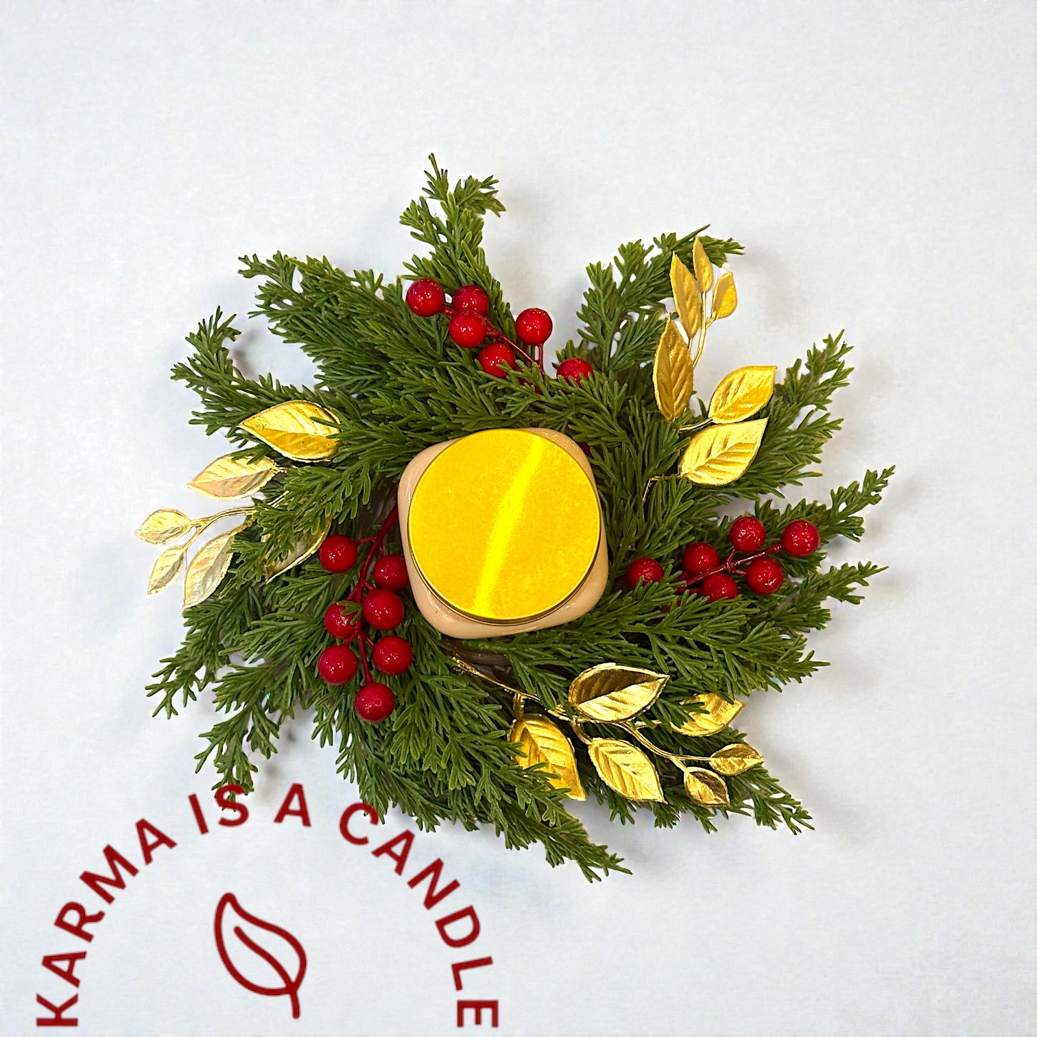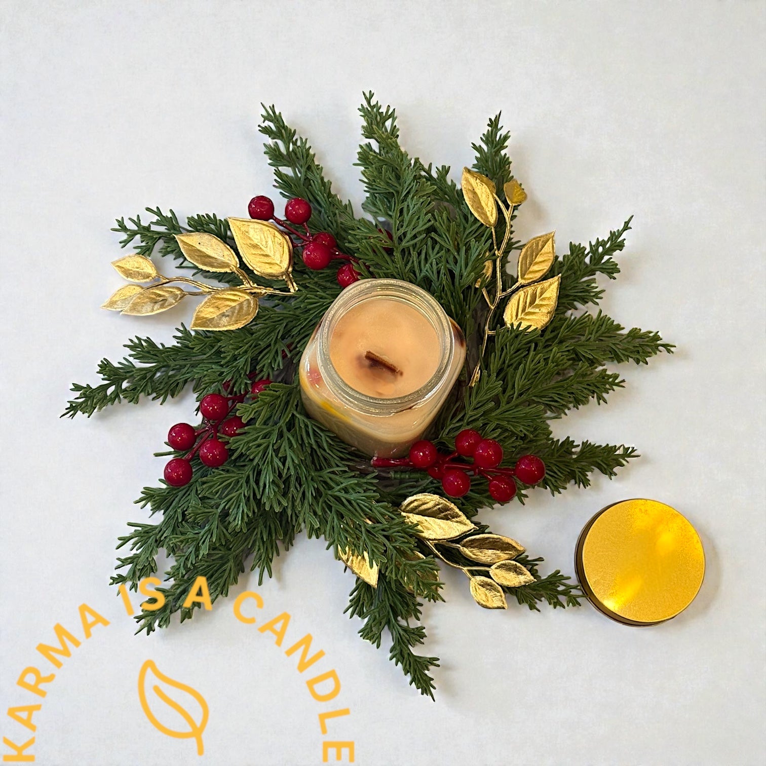 Φώτισε το γιορτινό σου τραπέζι με το elegant χριστουγεννιάτικο στεφάνι της Karma is a Candle, σχεδιασμένο ως το απόλυτο festive centerpiece. Στο κέντρο του ξεχωρίζει το χειροποίητο premium κερί 380ml, φτιαγμένο από 100% vegan σόγια, σε μοναδικά χρώματα που αντιστοιχούν σε διαφορετικά χριστουγεννιάτικα αρώματα (διαθέσιμα μόνο μέχρι εξαντλήσεως). Με μακρά, καθαρή καύση και επαναγεμιζόμενο γυάλινο βαζάκι, αποτελεί μια refined πρόταση art de la table που χαρίζει στο χριστουγεννιάτικο στρώσιμο ατμόσφαιρα υψηλής αισθητικής και ζεστής πολυτέλειας.