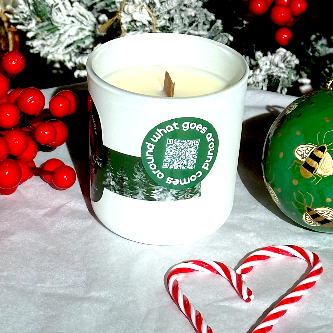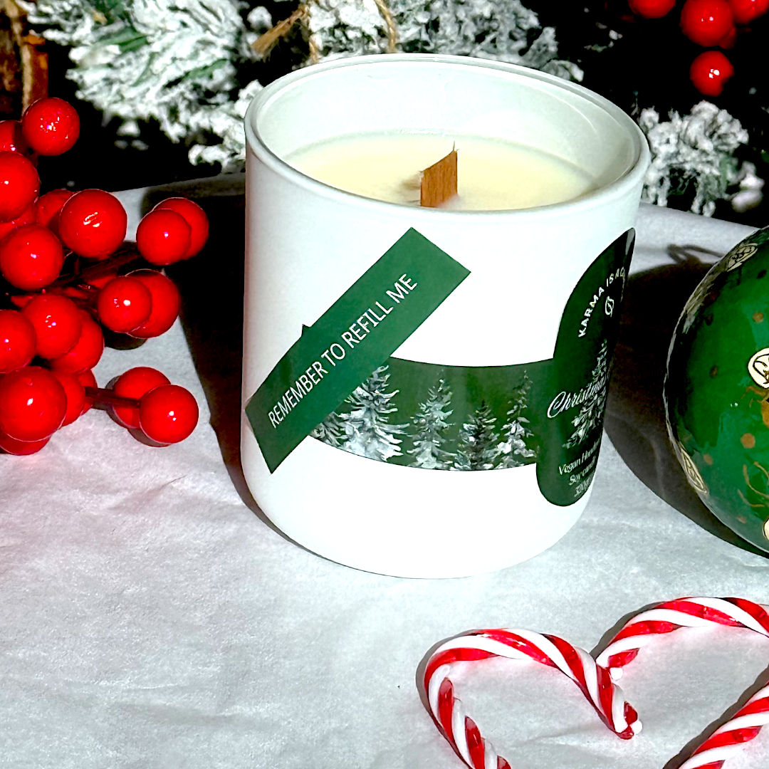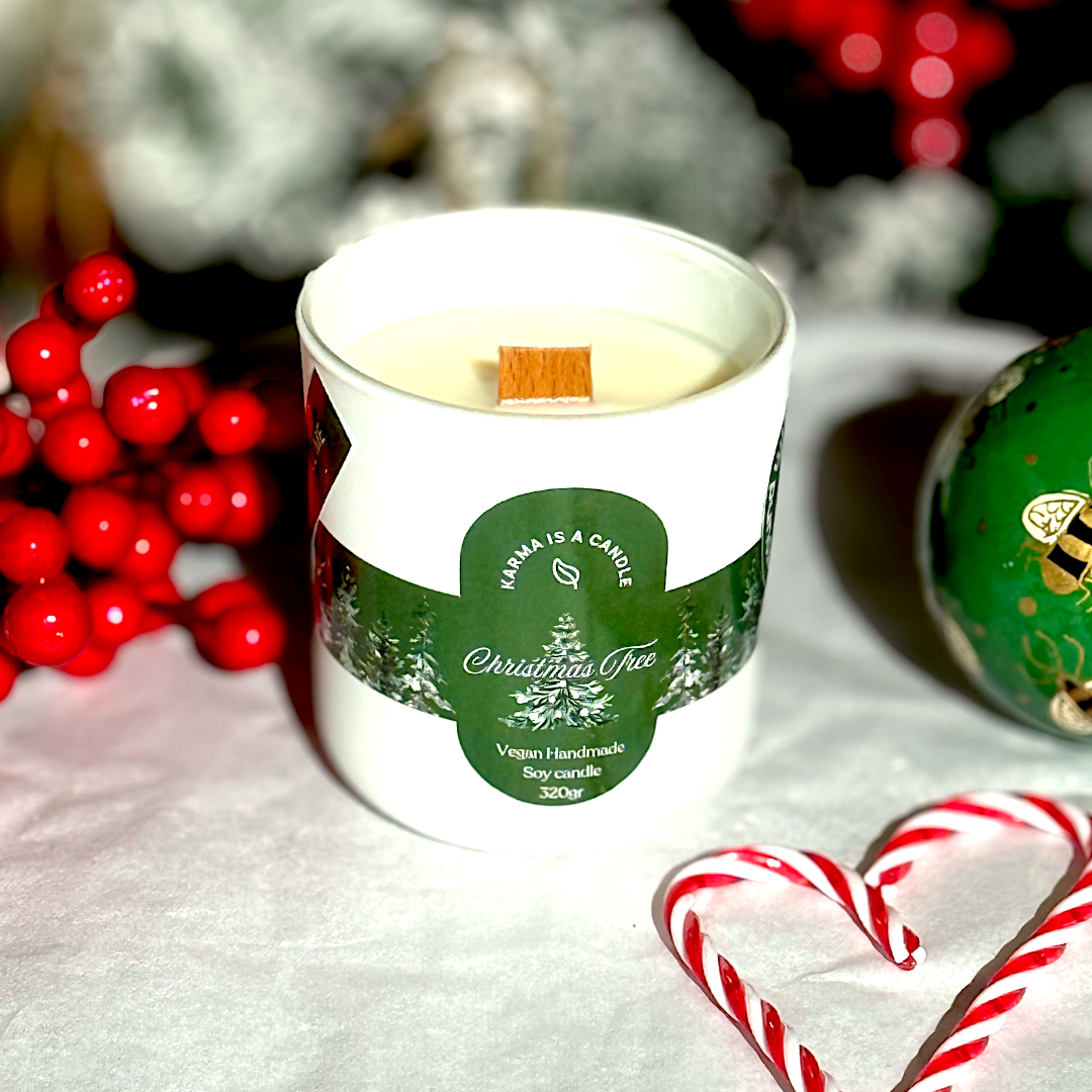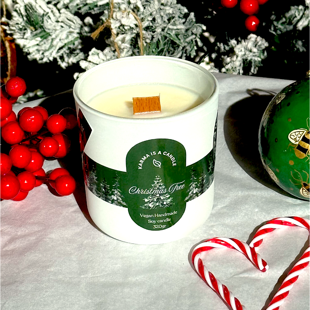 Μουσικό χειροποίητο κερί σόγιας& καρύδας 250ml (vegan) με ξύλινο φυτίλι και άρωμα Christmas Tree.