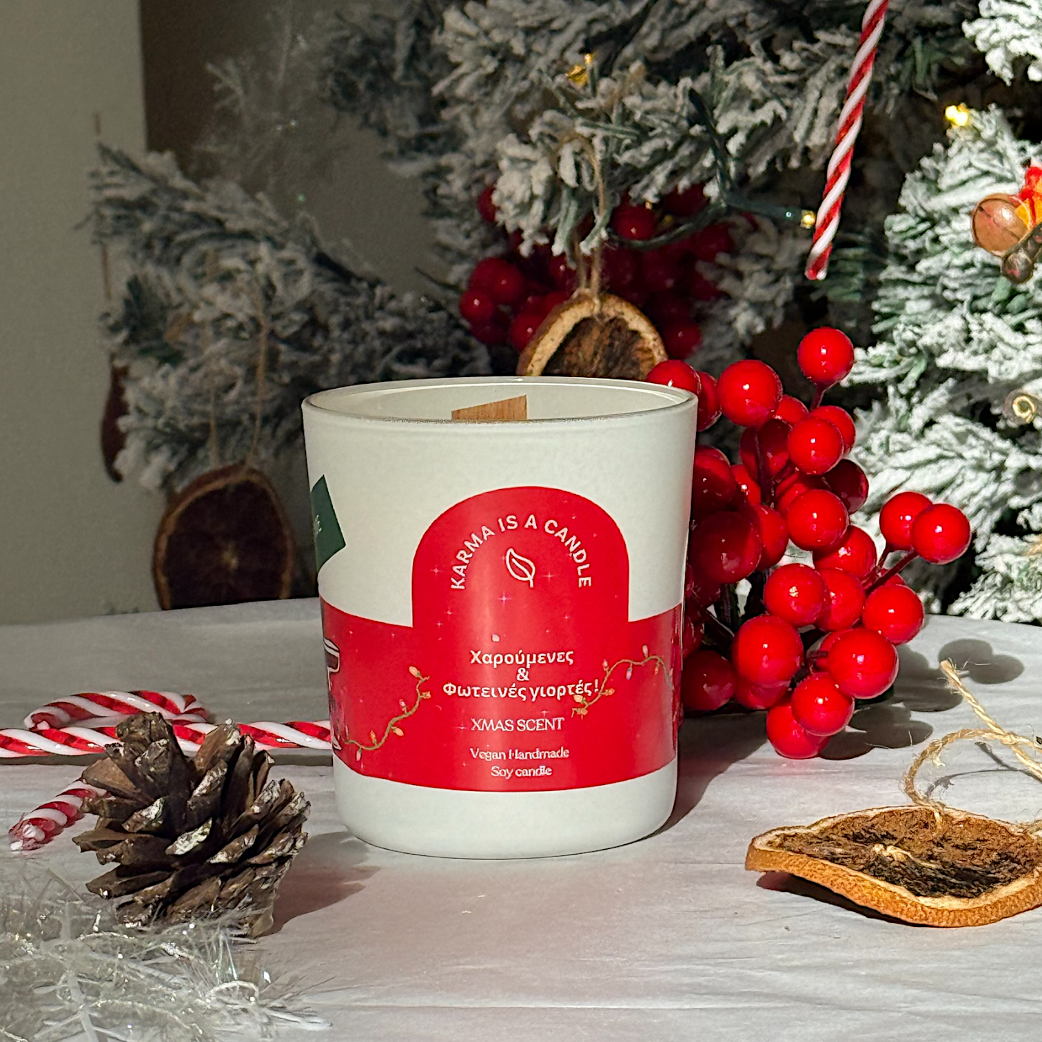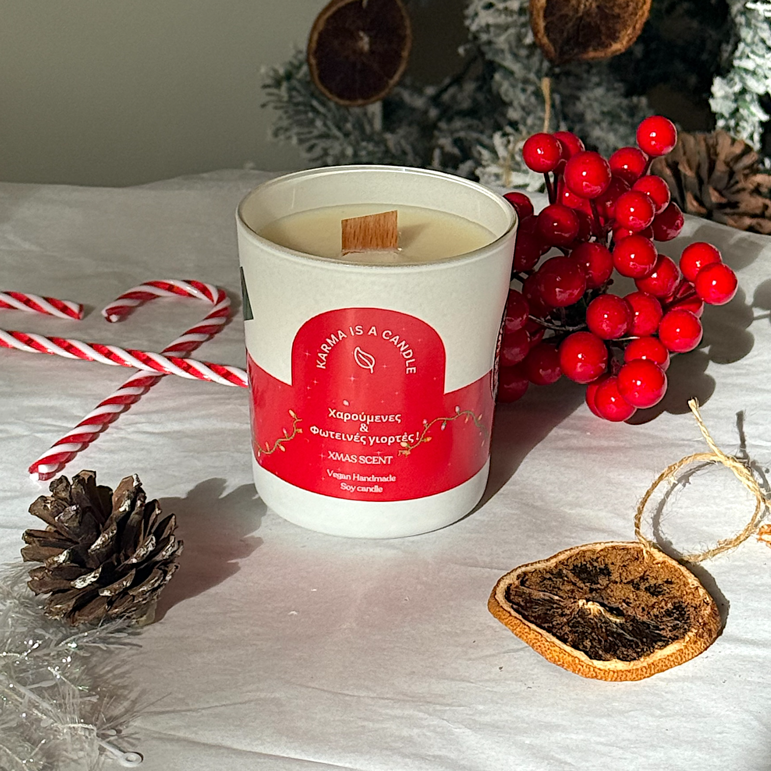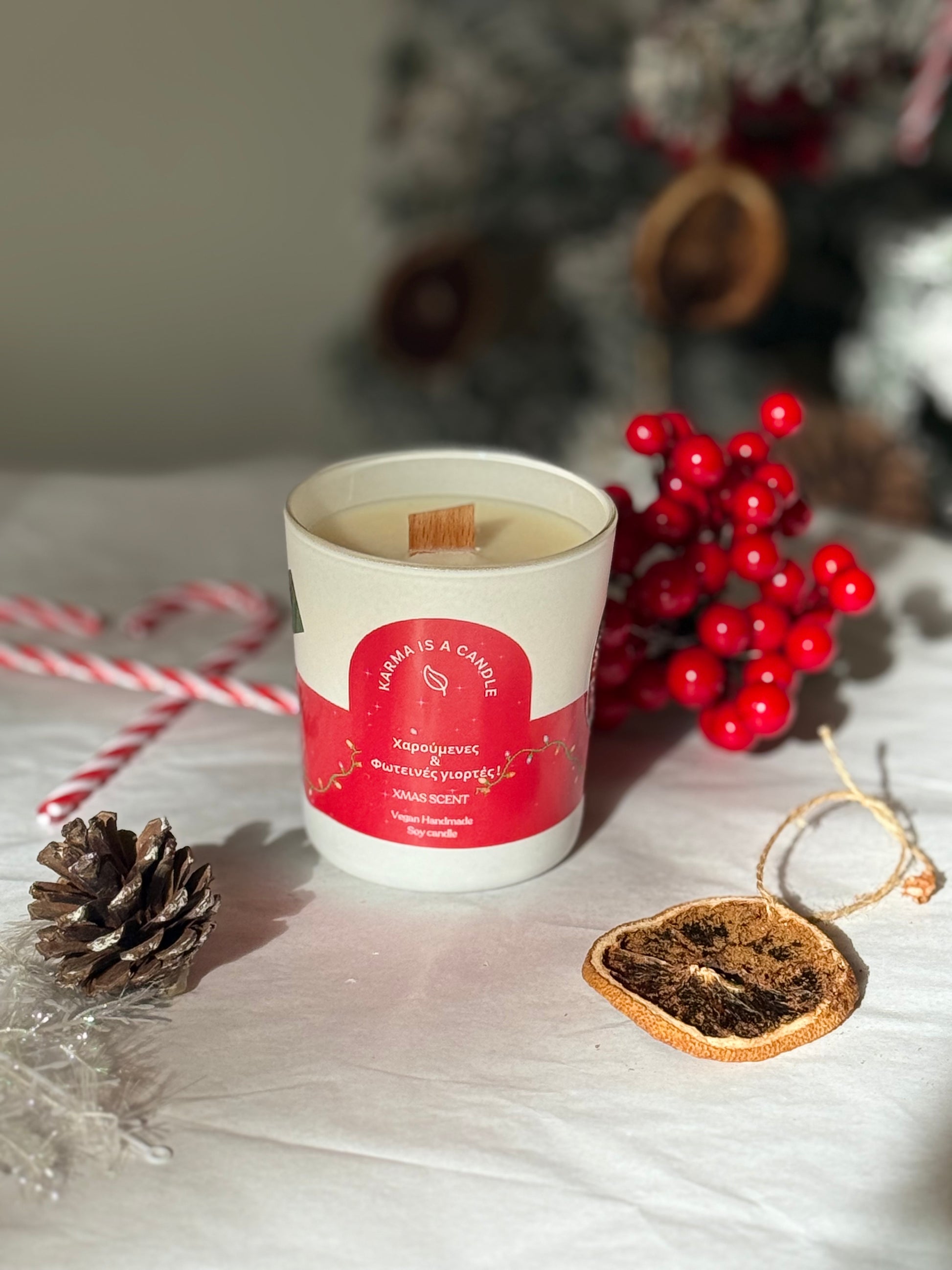 Ένα χειροποίητο, 250ml vegan κερί της Karma is a Candle που φέρνει τη ζεστασιά και τη γιορτινή ατμόσφαιρα στο χώρο σου. Το άρωμα μελομακάρονο γεμίζει το σπίτι με την αίσθηση των Χριστουγέννων, ενώ το ξύλινο φιτίλι δημιουργεί μια απαλή, χαλαρωτική καύση.