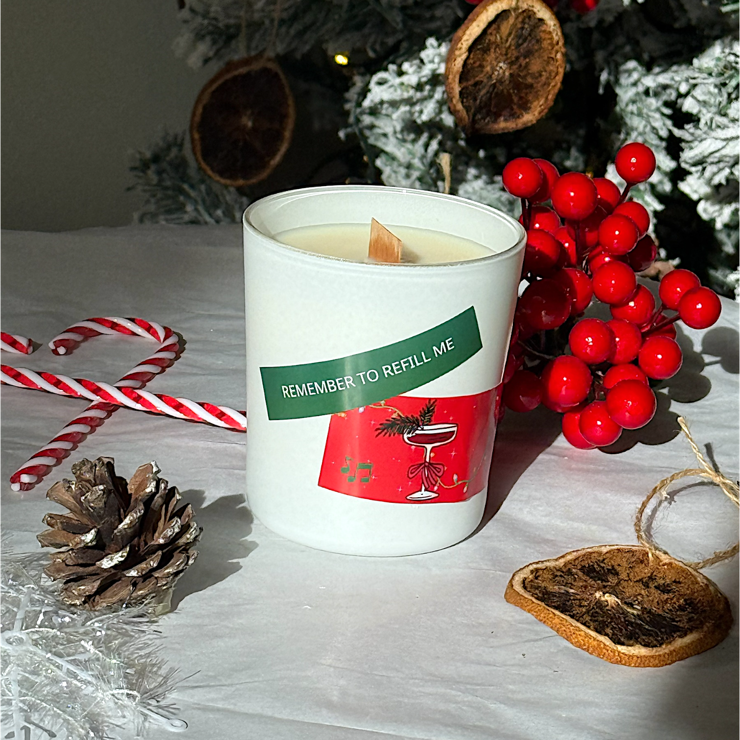 Το γυάλινο δοχείο είναι επαναγεμιζόμενο, ώστε το κερί να μπορεί να ανανεωθεί και να χρησιμοποιηθεί ξανά. Έτσι, η γιορτινή ατμόσφαιρα επιστρέφει κάθε φορά που τη χρειάζεσαι.