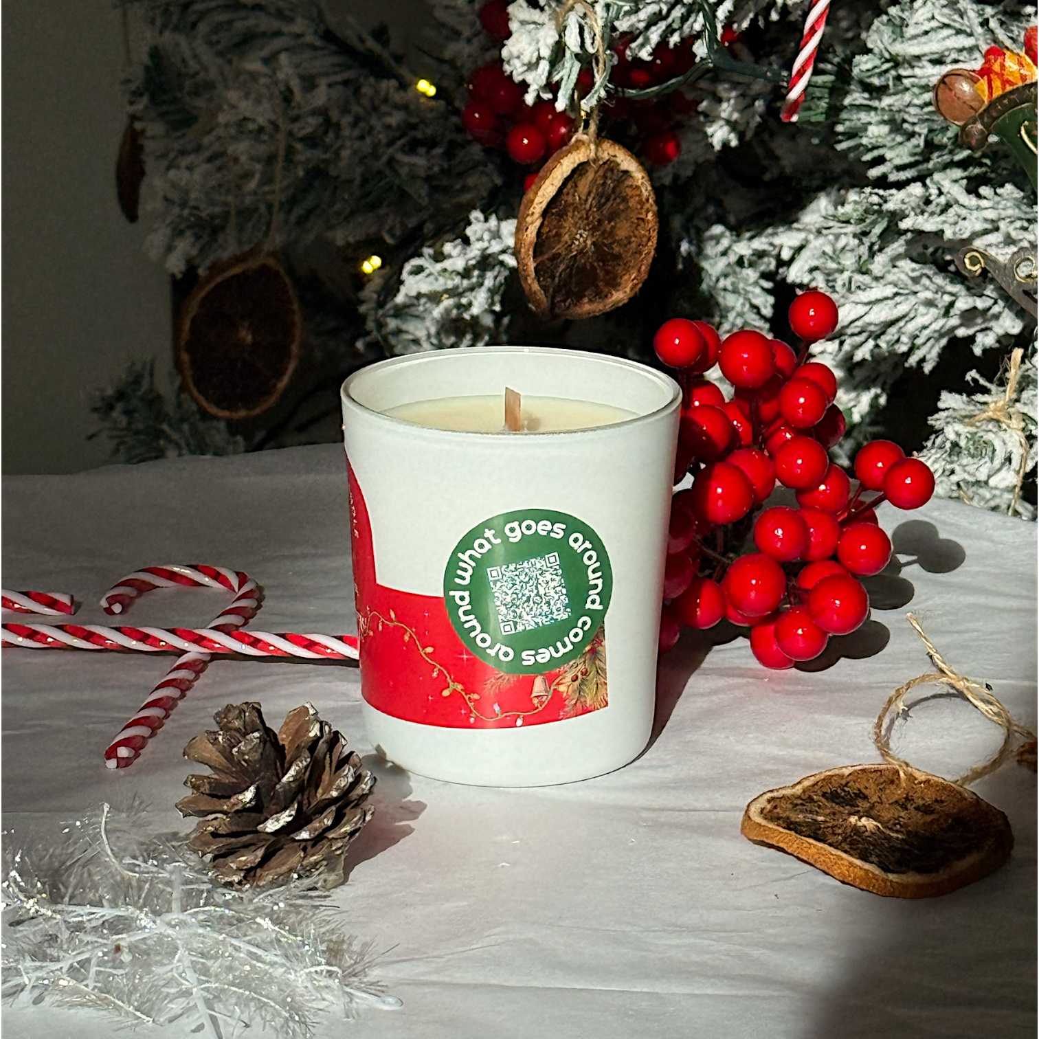 Σκάναρε το QR code στην ετικέτα και απόλαυσε μια επιλεγμένη, πεντάωρη χριστουγεννιάτικη playlist, ειδικά σχεδιασμένη για να σε βάλει πλήρως στο festive mood. Η εμπειρία γίνεται μουσική, άρωμα και φως μαζί.